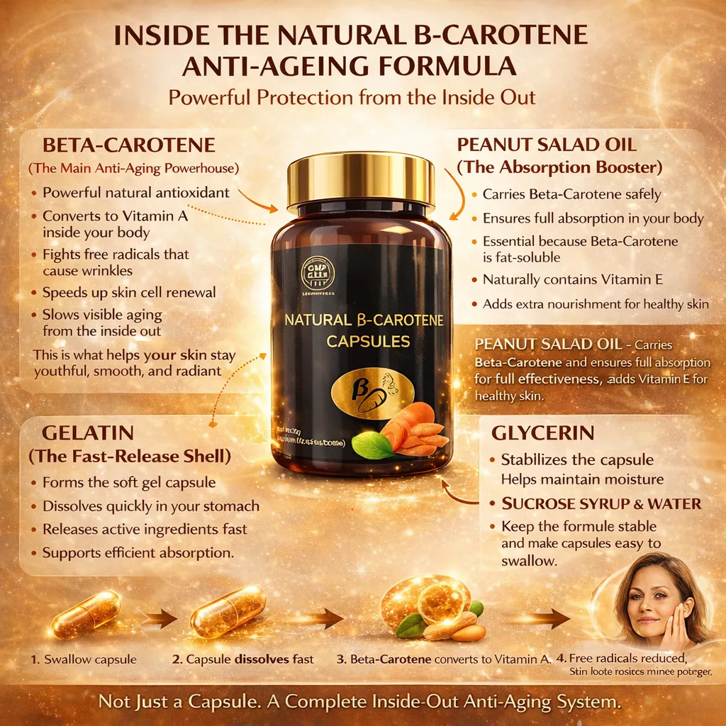 Every day, your skin is under attack from pollution, stress, processed foods, and sun exposure. Beta-Carotene forms a natural shield around your skin cells, protecting them from this daily damage and slowing down the aging process significantly.