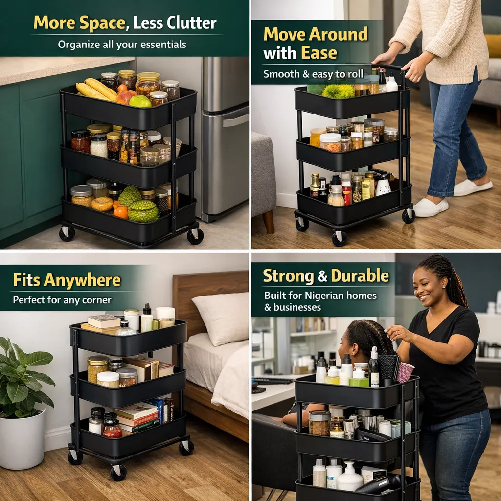 It comes with smooth rolling wheels so you can move it around easily. It is built with durable material that can handle everyday use. And the design is clean, simple, and fits perfectly into Nigerian homes.
