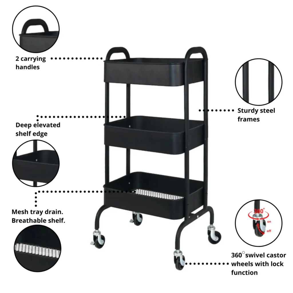 Whether it is your kitchen, your room, your office, your shop, or even your salon, this trolley gives you extra storage without taking up too much space.
