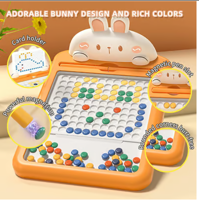 Inside this special board are hundreds of colorful magnetic beads sealed safely behind a clear screen. Your child picks up the magnetic pen and pulls the beads up one by one to create beautiful pictures – animals, cars, letters, numbers, anything their mind can imagine!