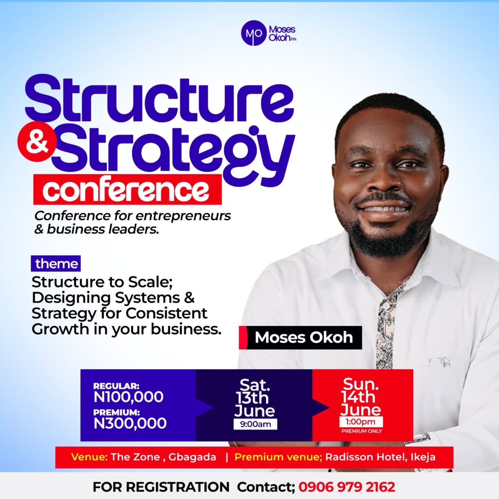 What you’re getting at STRUCTURED TO SCALE is not a single consultant. It’s Moses Okoh, who has personally trained and scaled more than 100 businesses to ₦1B+ in annual revenue, plus a curated group of expert speakers, 2 full days of intensive content that covers both the structural foundations and the growth strategy work most businesses have never done properly, and a personalised implementation plan for your specific business.
