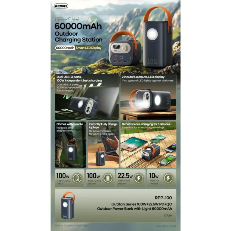 • Rapid Recharge (100W Input): Power banks with this much capacity often take forever to recharge, but not this one! Utilizing the 100W PD input, you can fully recharge the massive battery in a fraction of the time (e.g., in about 5 hours for the 60000mAh model)!