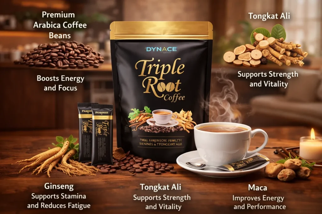 Powerful Natural Roots in Every Cup – A unique blend of premium coffee and powerful natural roots designed to support energy, stamina, focus, and overall vitality from within.