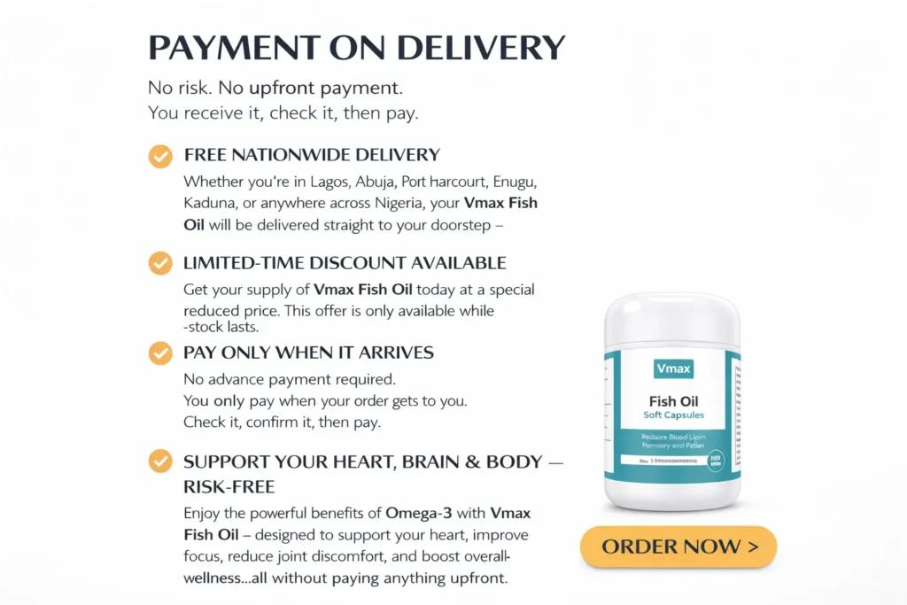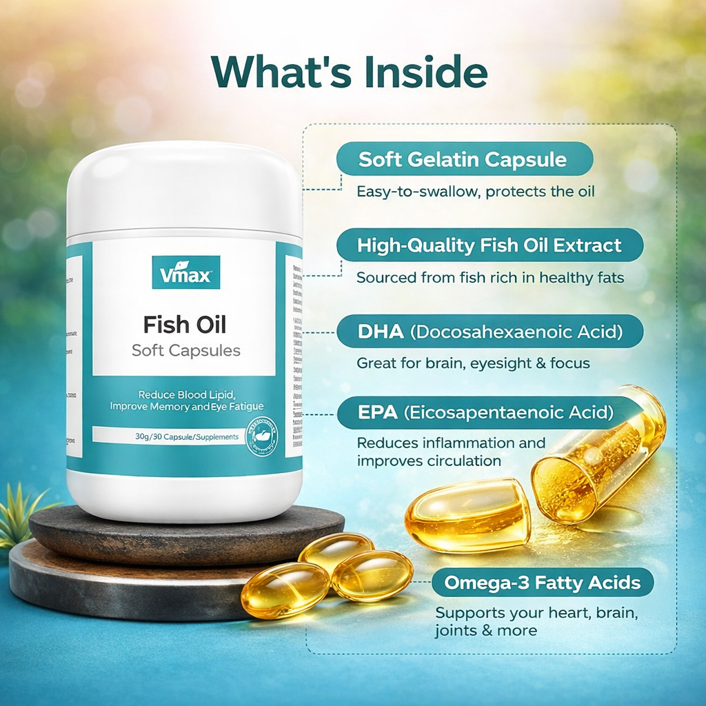 Vmax Fish Oil Soft Capsules is a premium daily supplement made from the oil of deep-sea fatty fish, the same oil that scientists around the world have studied for decades and confirmed to be one of the most powerful natural nutrients you can give your body.